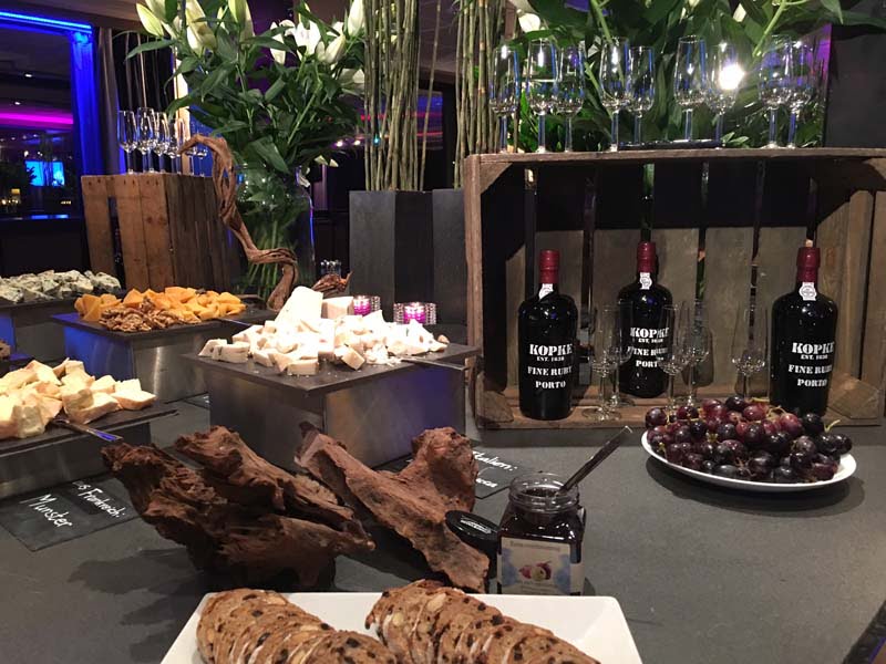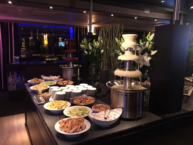 Om de twee druk bezochte dagen af te sluiten was er ’s avonds een knallend evenement aan boord. Het bedrijf had de targets gehaald en dat was reden genoeg voor een spetterend feest. De gasten hebben onder het genot van een zangeres, die trouwens spectaculair tijdens het diner via het hydraulische podium ‘uit de grond’ ophoog kwam en ineens tussen de gasten stond, genoten van een uitgebreid buffet en dessertbuffet met chocolade fonteinen, minidesserts en een kaasbuffet. Als grande finale knalde de DJ het dak eraf en stond iedereen te swingen op de dansvloer.